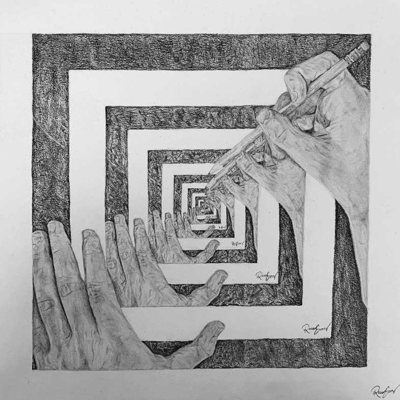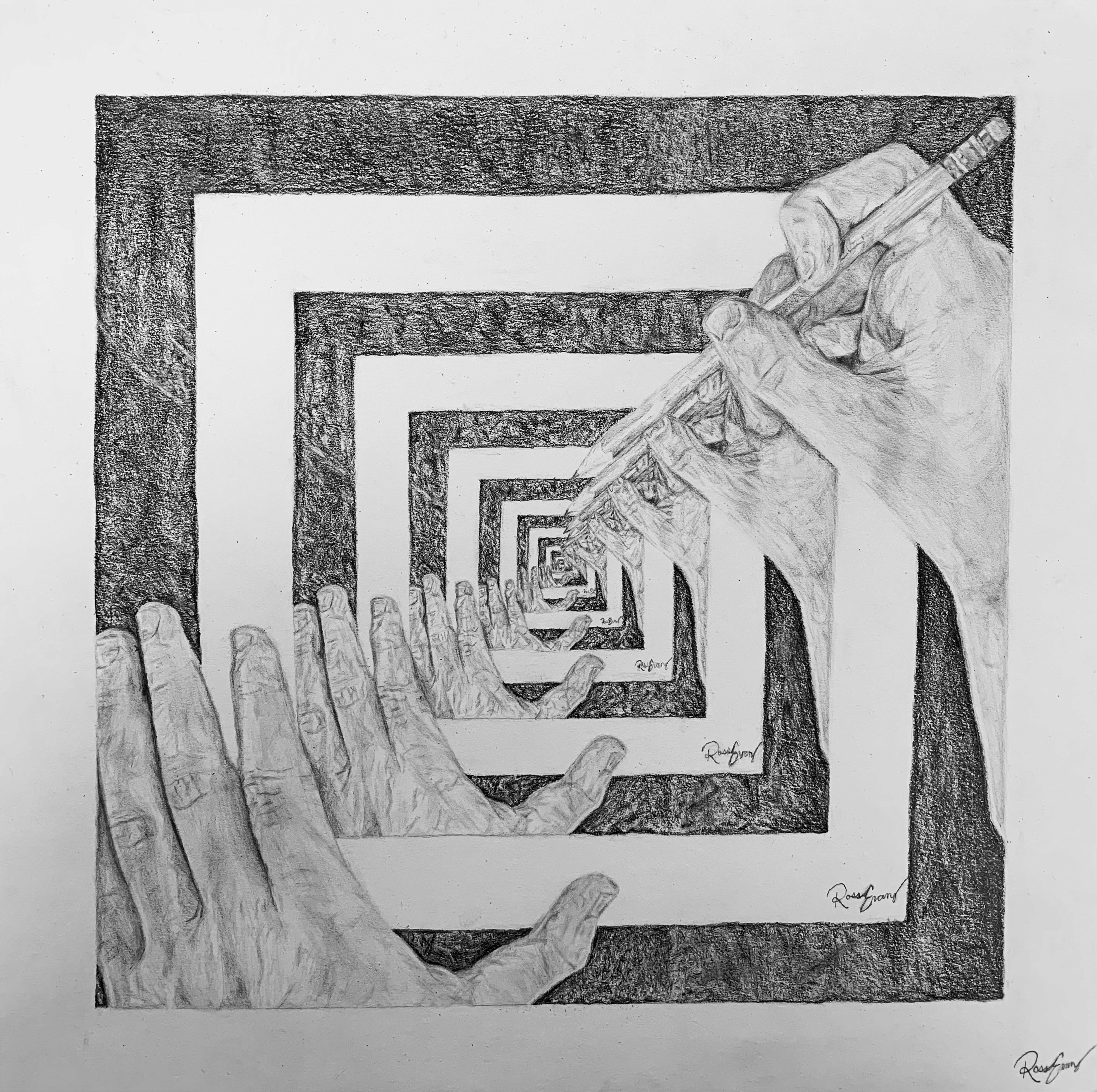 A hand drawing a hand, drawing a hand, drawing a hand... The word “inception” refers to the creation or starting point of something. All art has to start somewhere, and this drawing depicts my hands when they first put the pencil to the page. The many hands also represent how I have so many ideas, and want to work on all of them at once. In addition to these meanings, the piece is a representation of creativity in general, and how the conception of one drawing idea immediately leads to the next, lending a “hand” to a new project’s beginning.