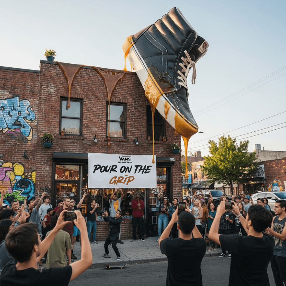 Urban and bold, with skaters mid-air leaving sticky syrup trails, comic-strip motion lines, and pop-art splashes. Vans’ signature black-and-white checkerboards will be present in the backgrounds, and lifestyle photography will have bright/colorful accents, with pop-art halftones and literal splashes of color. There will be graffiti-style drippy type + trailing type resembling motion, and a slightly more playful tone than their typical work.